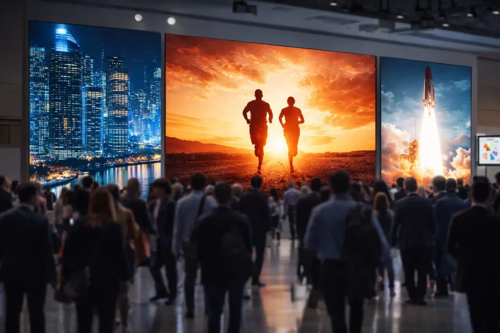 Large LED walls and high-definition display screens create strong visual presence inside busy exhibition halls. Motion content naturally draws attention and increases visitor footfall.