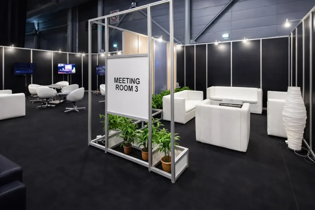 Comfortable sofas, chairs, and lounge setups create a welcoming environment inside your booth. When visitors feel comfortable, conversations last longer — and longer discussions increase closing potential.